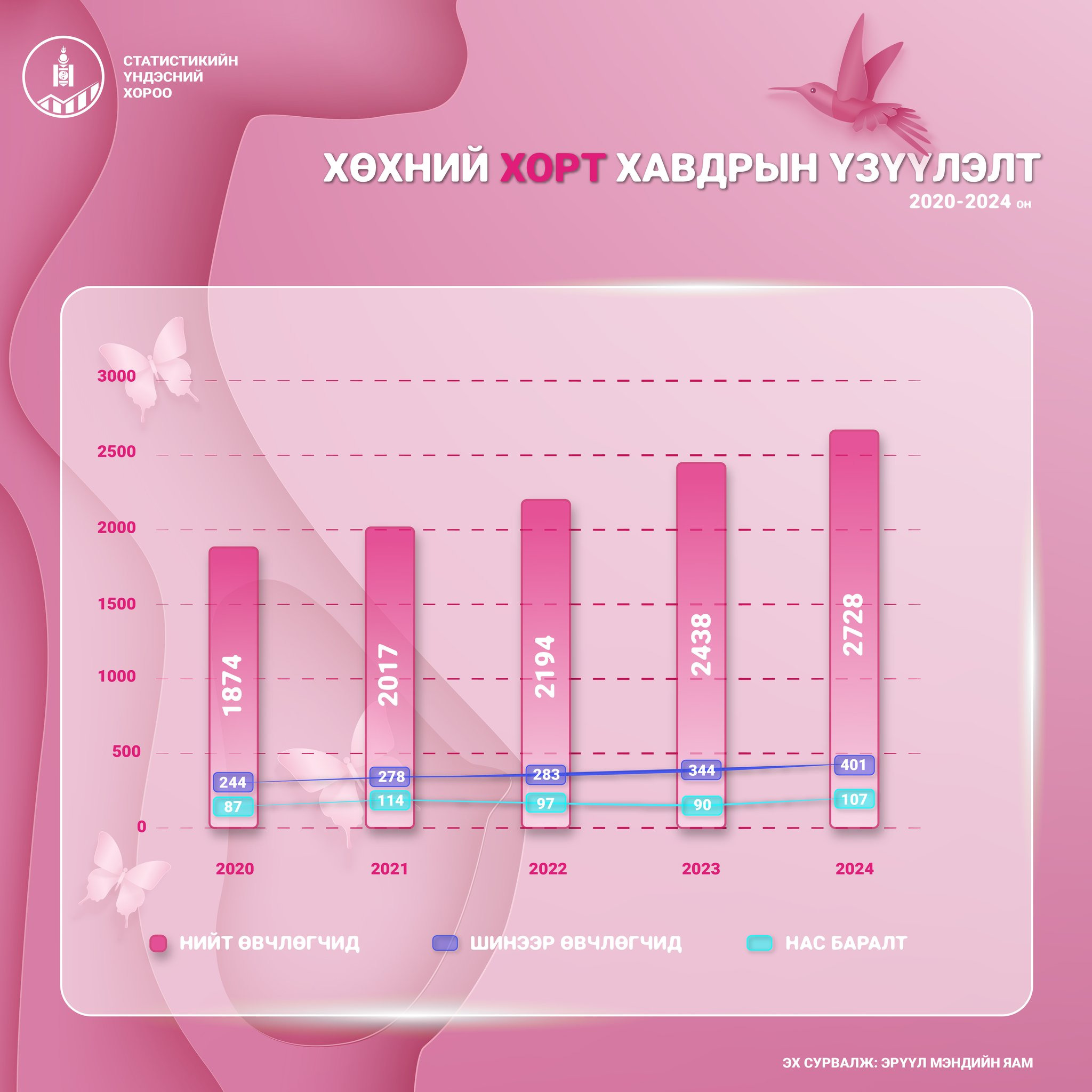 Эрүүл мэндийн яамны мэдээлснээр 2024 оны байдлаар улсын хэмжээнд хөхний хорт хавдраар 2728 хүн оношлогдсоноос 401 нь шинээр оношлогджээ.