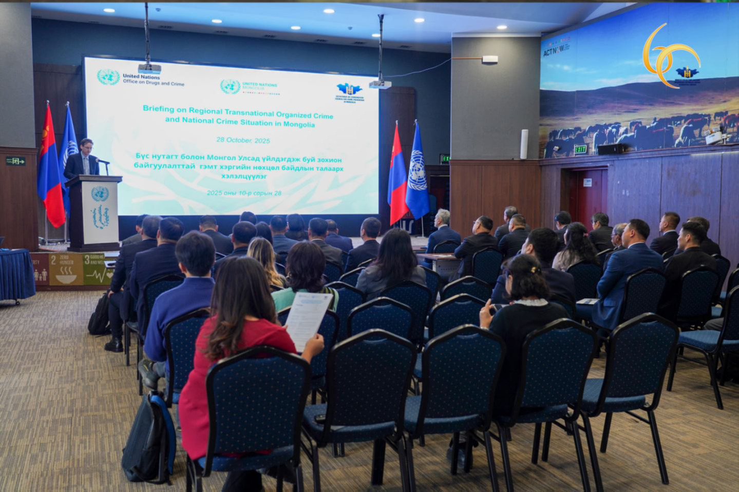 “Бүс нутагт болон Монгол Улсад үйлдэгдэж буй зохион байгуулалттай гэмт хэргийн нөхцөл байдал” хэлэлцүүлэгт үндэстэн дамнасан зохион байгуулалттай гэмт хэрэгтэй тэмцэх, урьдчилан сэргийлэх чиг үүрэг бүхий олон улсын болон хууль сахиулах байгууллага, дипломат төлөөлөгчийн газрын 60 гаруй төлөөлөл оролцлоо.