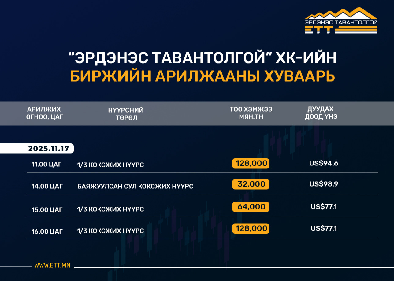 "Эрдэнэс Тавантолгой" ХК-ийн 2025 оны 11 дүгээр сарын 17-ны өдрийн биржийн арилжааны хуваарийг хүргэж байна.