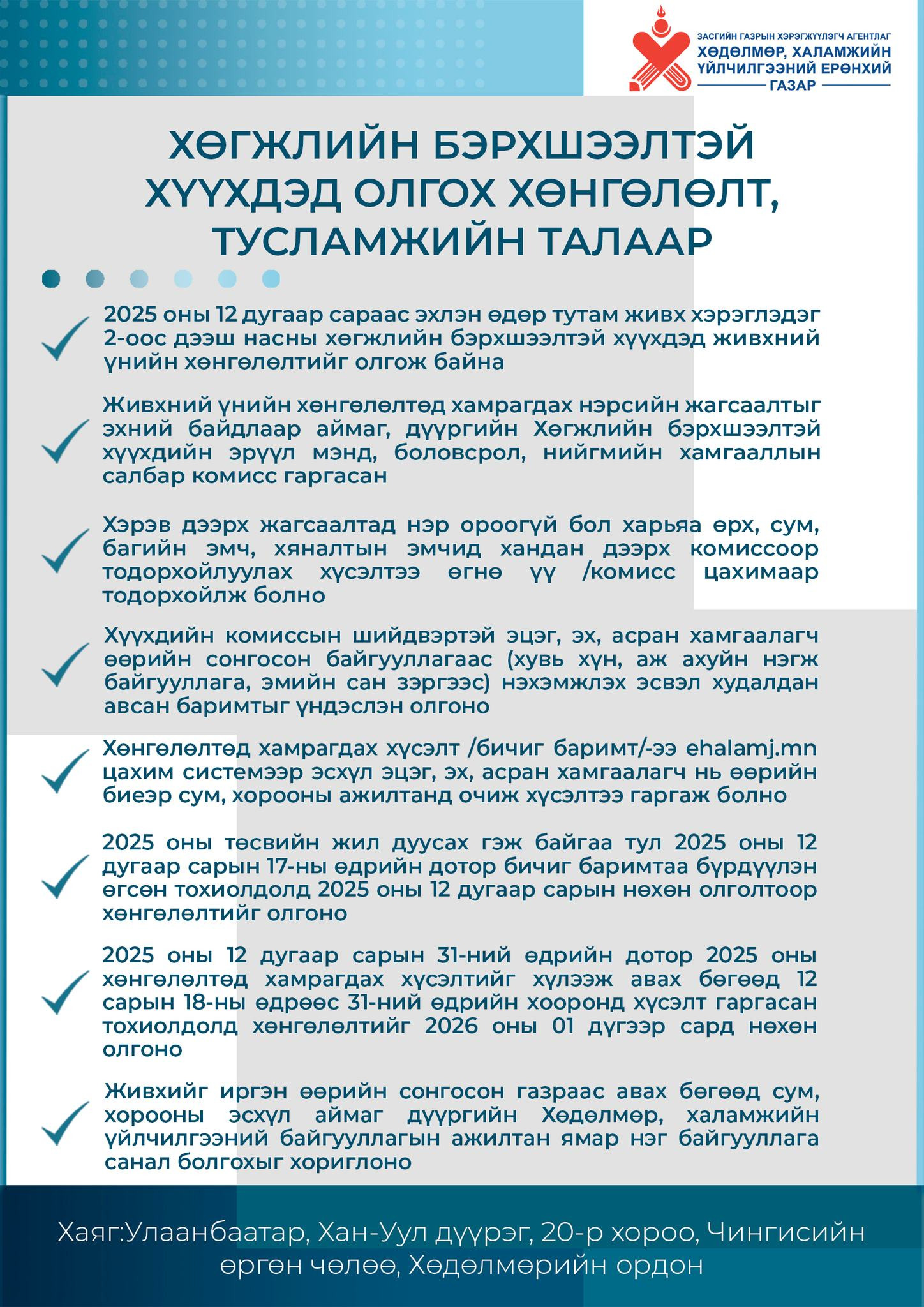 2025 оны 12 дугаар сараас эхлэн өдөр тутам живх хэрэглэдэг 2-оос дээш насны хөгжлийн бэрхшээлтэй хүүхдэд живхний үнийн хөнгөлөлтийг олгож байна;