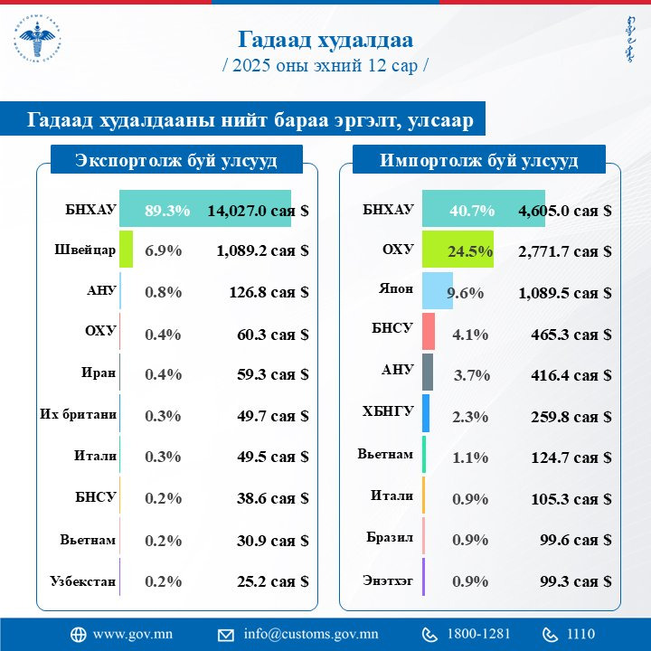 Экспортын дүн импортын дүнгээс 4389.4 сая ам.доллараар давж, гадаад худалдааны баланс эерэг гарлаа.