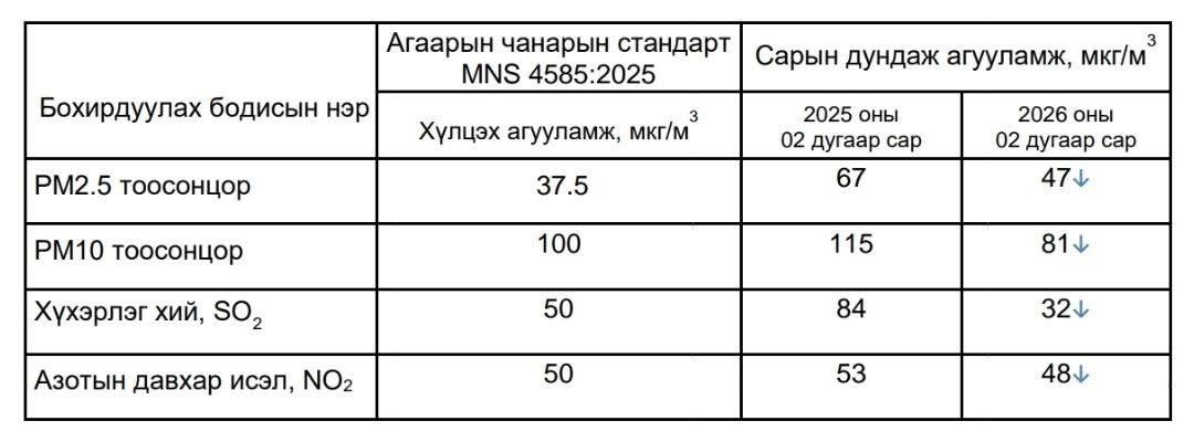 Агаар бохирдуулах бодисын 2026 оны 02 дугаар сарын дундаж агууламжийг өмнөх оны мөн үе буюу 2025 оны 02 дугаар сарын дундаж агууламжтай харьцуулахад: