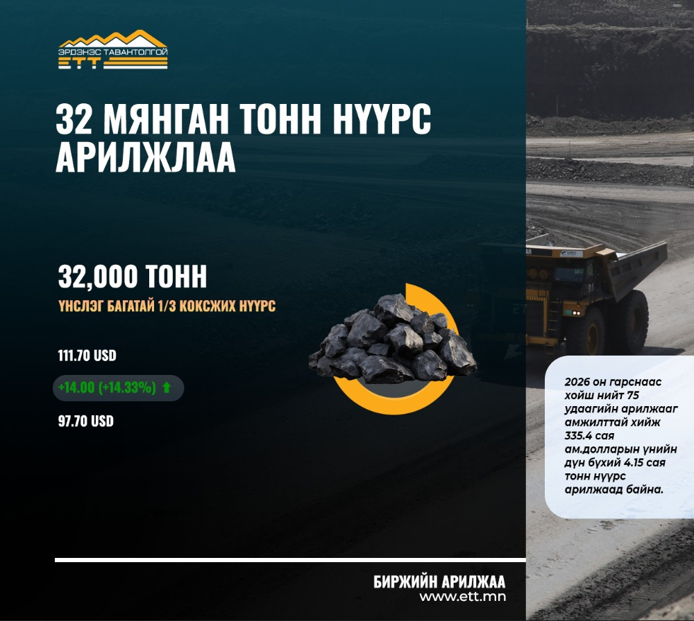 2026 онд 75 удаагийн арилжаагаар 335.4 сая ам.долларын үнийн дүн бүхий 4.15 сая тонн нүүрс арилжлаа.