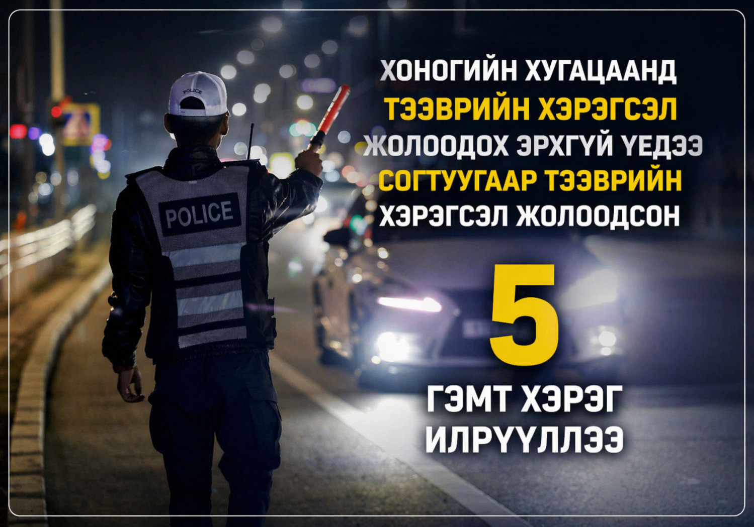 Хоногийн хугацаанд тээврийн хэрэгсэл жолоодох эрх хасагдсан үедээ согтуугаар тээврийн хэрэгсэл жолоодсон 5 гэмт хэргийг илрүүллээ.