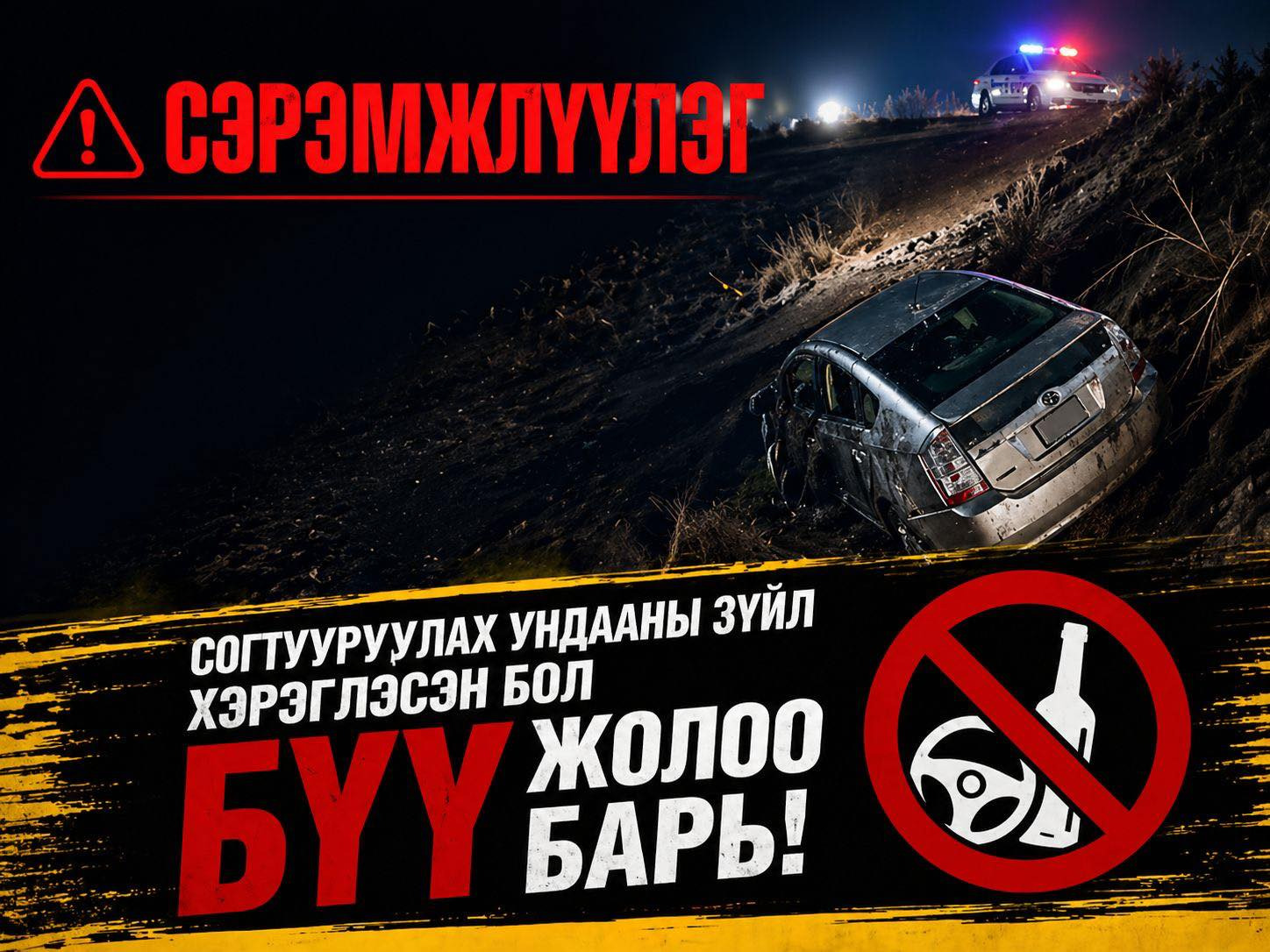 Иймд жолооч та замын хөдөлгөөнд оролцохдоо хариуцлагатай байж, согтууруулах ундааны зүйл хэрэглэсэн үедээ жолоо барихгүй байх, замын хөдөлгөөний дүрмээ баримтлан, анхаарал болгоомжтой зорчихыг цагдаагийн байгууллагаас анхааруулж байна.